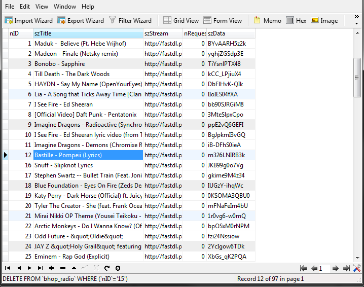 Beschrijving: Dit is een afbeelding van een tabel in een database die gedownloade en geconverteerde YouTube video's opsloeg. Hier werden door gebruikers ingevulde video's aan toegevoegd. De GUI is die van Navicat, om gemakkelijk een tabel te bekijken.